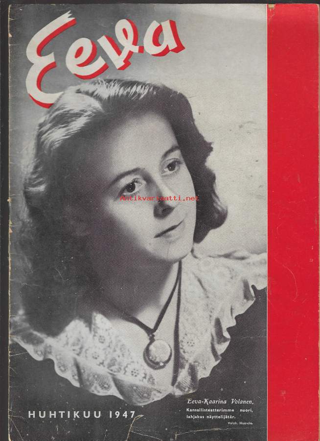 Eeva 1947 nr 4 huhtikuu, sis. mm. seur. artikkelit / kuvat / mainokset; Kannessa Eeva-Kaarina Volanen, Malabarin rannikolla, Kuukauden paras elokuva, Aistikasta