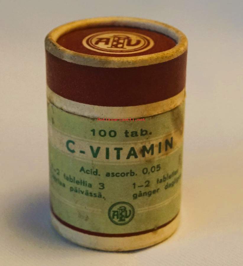 C -vitamin tyhjä lääkepurkki pahvia 50x30 mm apteekki lääkepakkaus