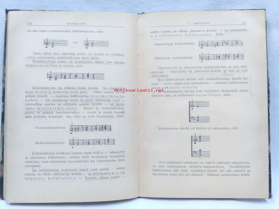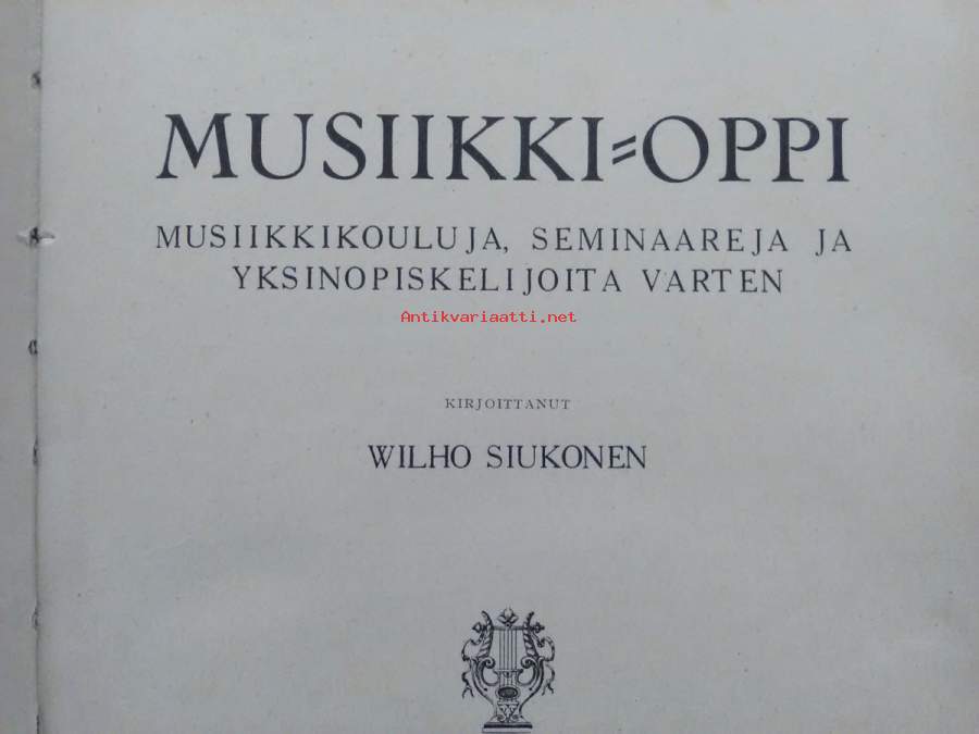 musiikki-oppi, omistus, kansissa kulumaa, sivuilla runsaasti lyijykynämerkintöjä, joillakin sivuilla rispaumaa, hiukan kulmataitetta