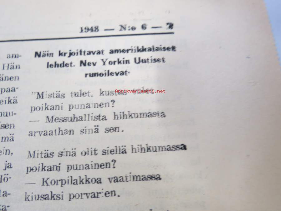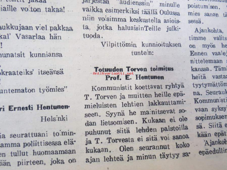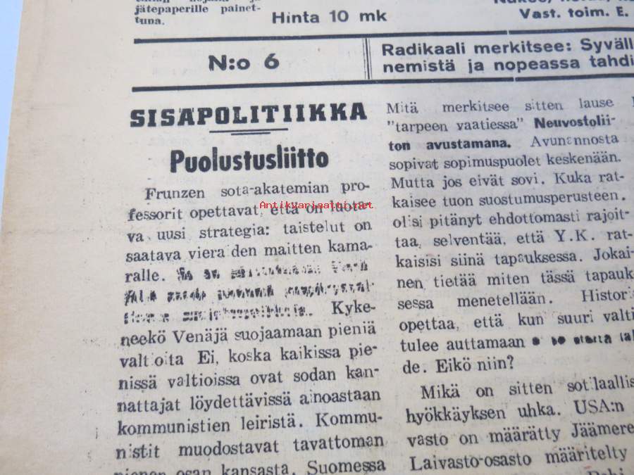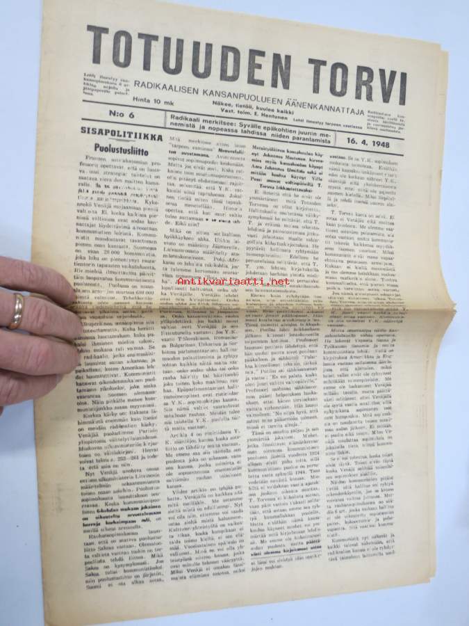Totuuden Torvi 1948 nr 6, Ernesti Hentunen, Radikaalinen kansanpuolue -julkaisu, paljastuksia, skandaaleja, äärioikeiston naamioitumispyrkimyksiä, ym.