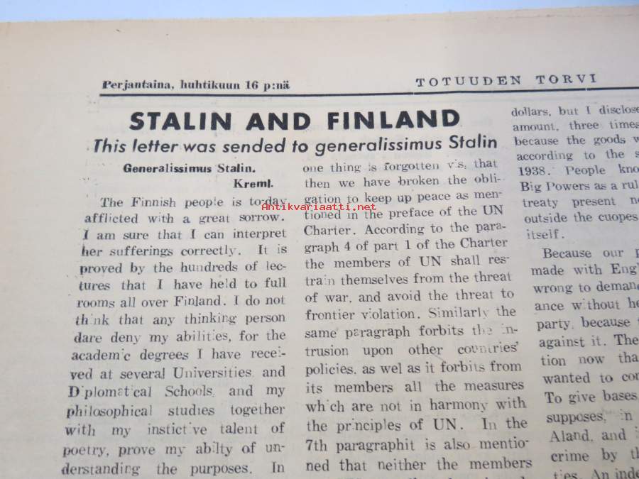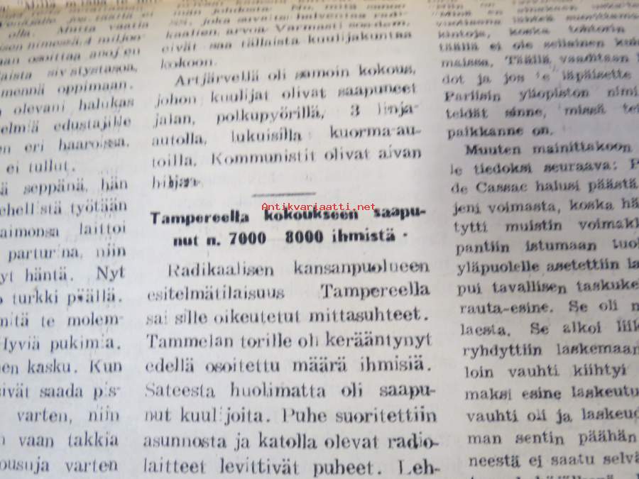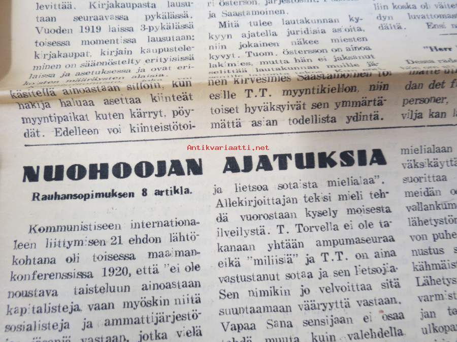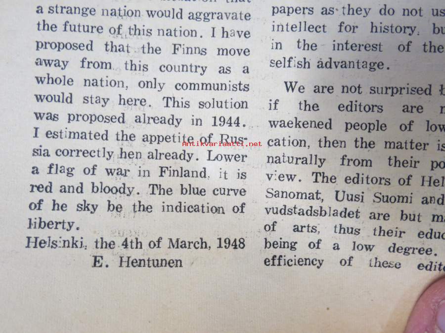 Stalin and Finland, Nykyajan filosofian käsitys sielusta, Angina pectoris, ym. Päätoimittaja Ernesti Hentunen, puolueensa äänenkannattaja, sisältää hyvinkin yksityiskohtaisia ja avoimia paljastuksia sekä syytöksiä yksityishenkilöistäkin.
