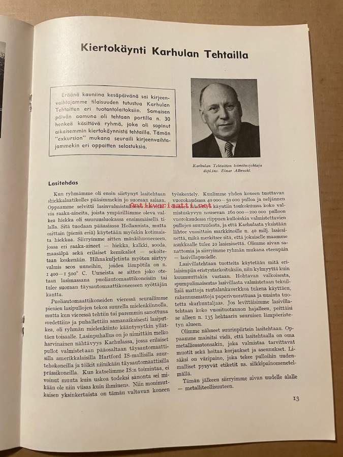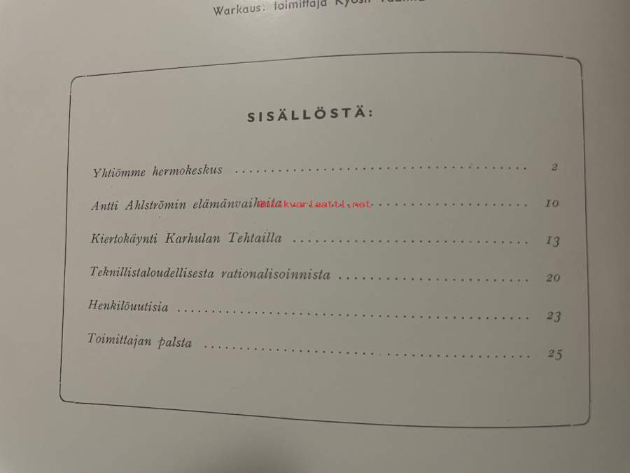 Me kaikki A. Ahlström Osakeyhtiön henkilökuntalehti 1956 nr 2, Noormarkun tehdas, kiertokäyntejä Karhulan tehtailla,
