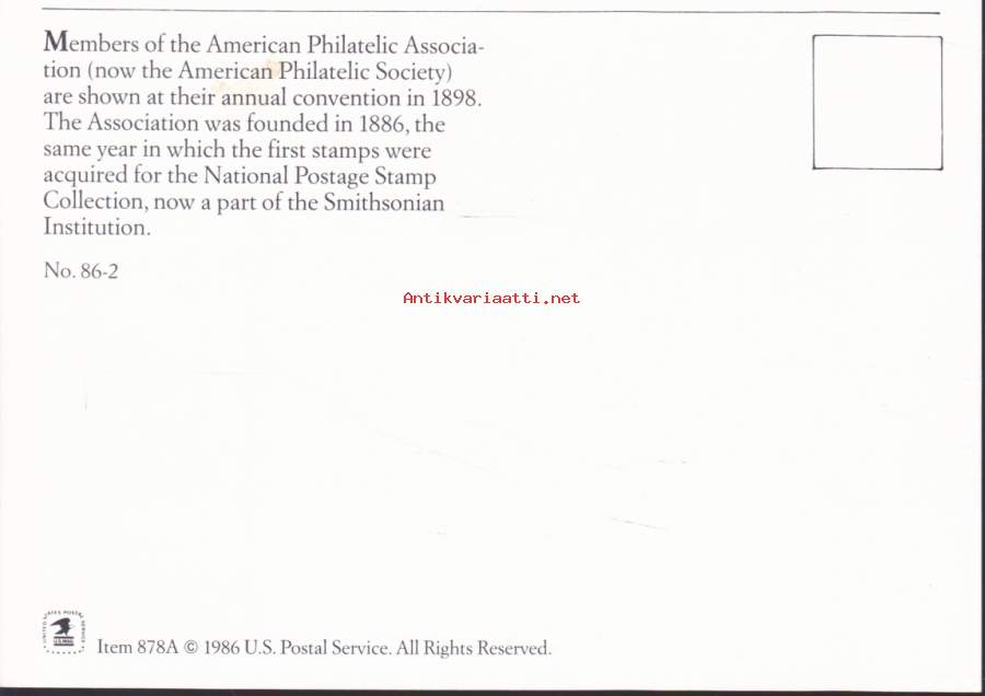 FDC/Maksimikortti – USA 23.1.1986. – Stamp Collecting/ American Philatelic Society 1898 -kortti. Postimerkkeily.