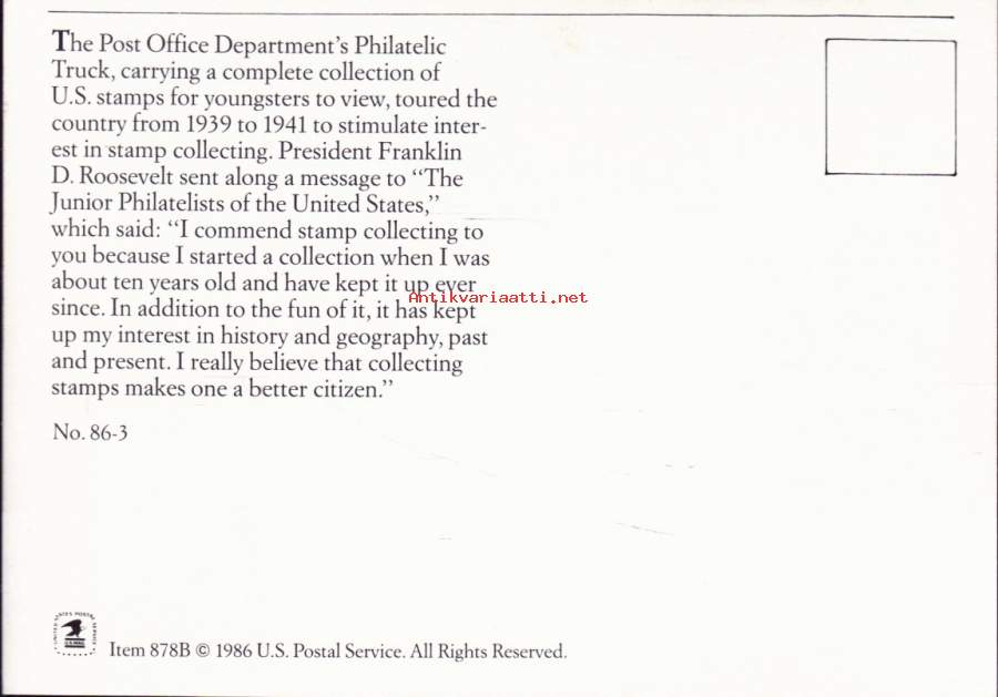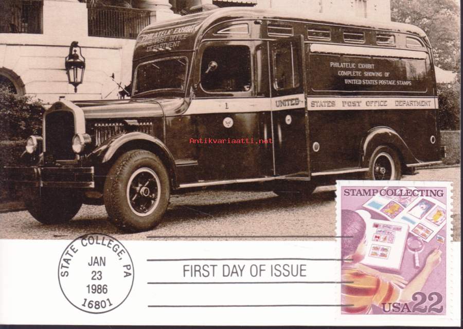 FDC/Maksimikortti – USA 23.1.1986. – Stamp Collecting/ Philatelic Truck -Postimerkkikuormuri, jossa esillä kaikki USA:n postimerkit?