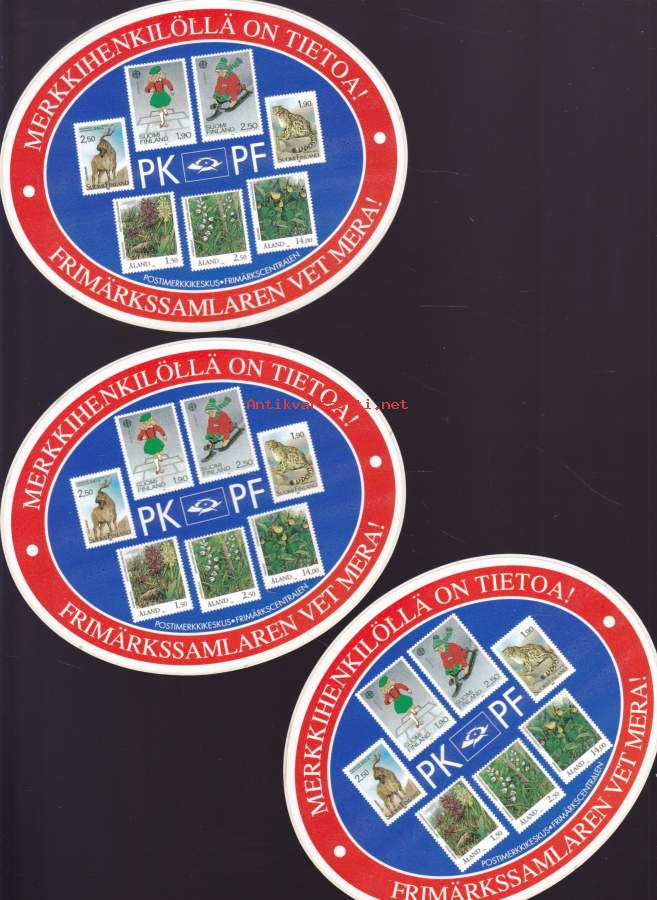 Tarra 3 kpl - Merkkihenkilöillä on tietoa - Frimärkssamlaren vet mera. 14 x 11 cm.