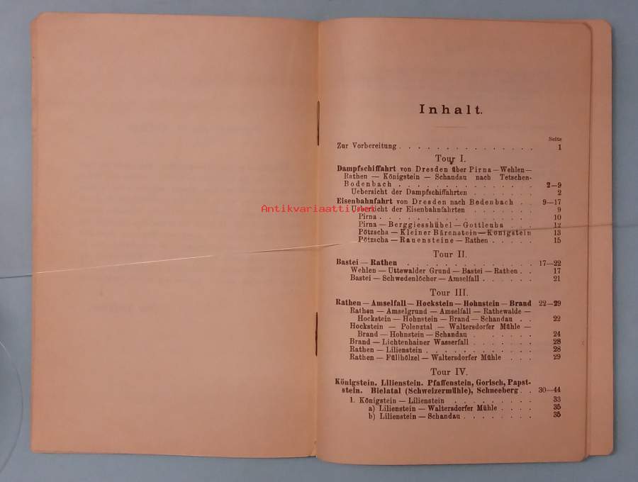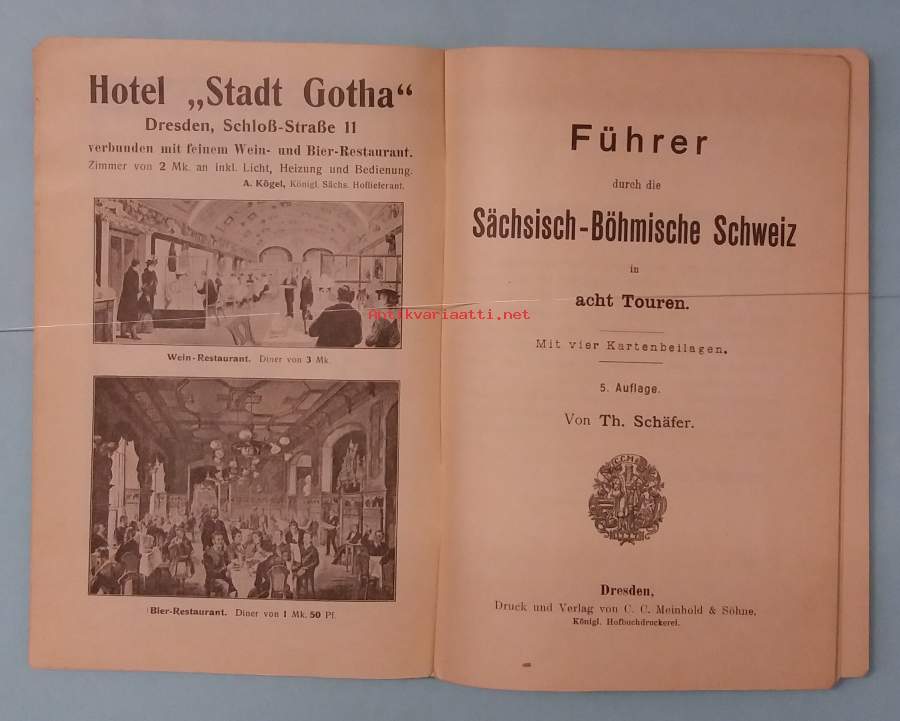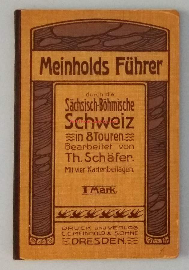 5. Auflage. Von Th. Schäfer. Dresden, Druck und Verlag von C. C. Meinhold & Söhne, Königl. Hofbuchdruckerei. Sisällöllisesti ei puutteita: sivumäärä (100) ja karttaliiteet täsmäävät kirjastotietueeseen (XII, 100 S. + 4 karttaa). Varhainen 1900-luvun matkaopas Sächsisch-Böhmische Schweiz -alueelle, kahdeksaan kiertomatkaan jaoteltuna + Ephemera. Dimensiot 17 ¤ 11 cm.