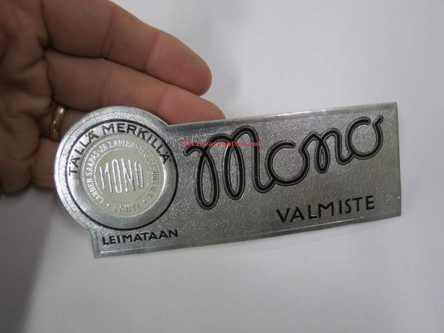 Mono valmiste - Lahden Saapas- ja Lapikasteollisuus Oy -hintalappu / tuotetietolappu, merkin valmistaja Herman Mattsson Korkokuvapaino & Pussitehdas, Vaasa