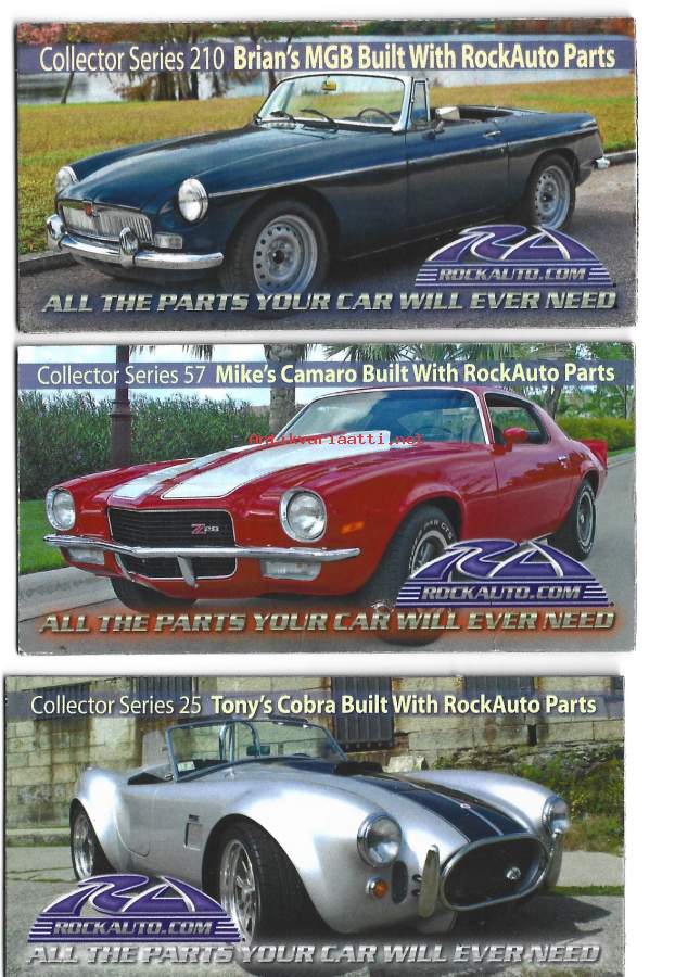 Rock Auto Parts - Cobra, MGB ja Camaro jääkaappimagneetti 5x10 cm 3 eril