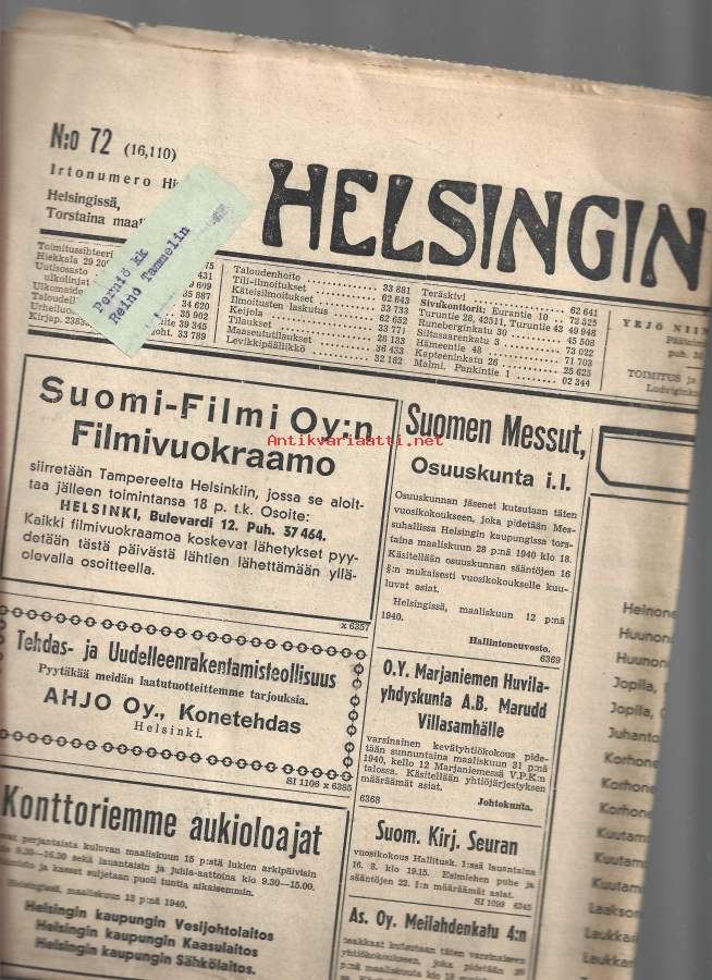 Helsingin Sanomat 14.3. 1940