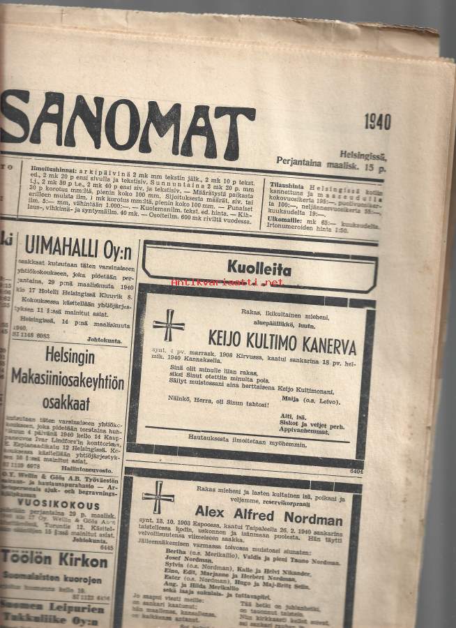 Helsingin Sanomat 15.3. 1940