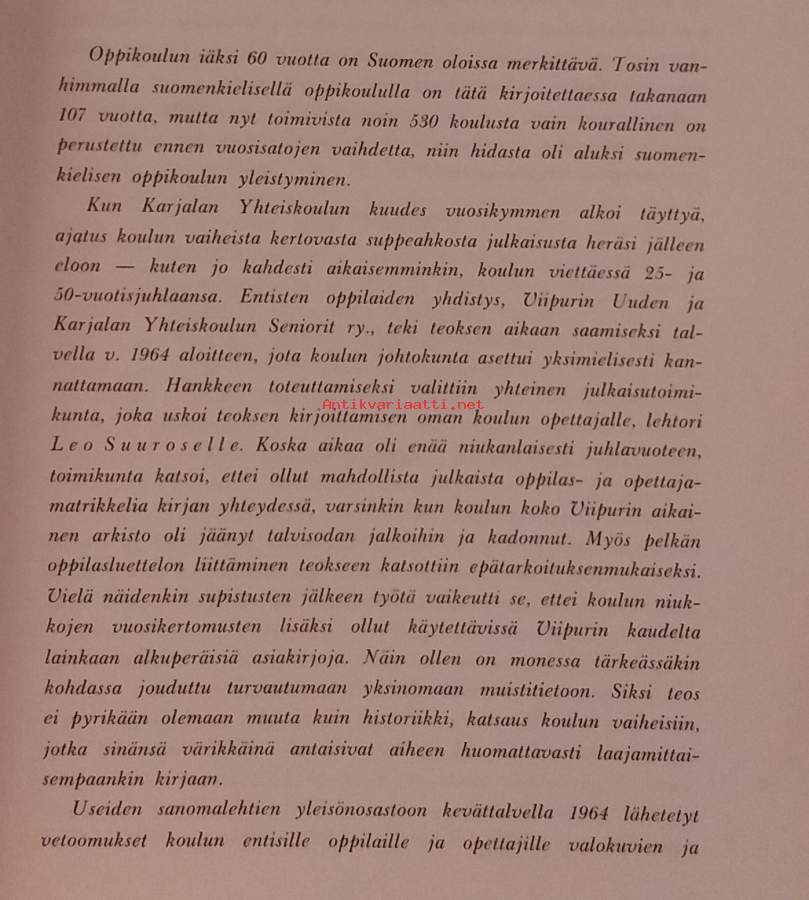 Teos käsittelee koulun vaiheita, perustamista Viipuriin, siirtymistä sodan myötä uuteen paikkaan, sekä sen kehitystä ja elämää 60 vuoden ajanjaksolla. Historiikki esittelee perusteellisesti Viipurin uuden yhteiskoulun ja sen toiminnan jatkajan, Karjalan yhteiskoulun, historian vuosina 1905–1965 Dimensiot 25 ¤ 19 cm
