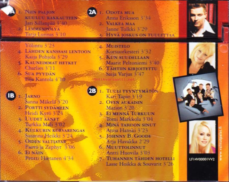 **1A1 Yölintu– Pieni Lintunen 3:06**1A2 Eija Kantola– Minut Nauramaan Saat 3:40**1A3 Janne Hurme– Kulkija 3:10**1A4 Pepe Willberg– Kosketus Jää 4:04**1A5 Charlies (2)– Ruskeat Silmät 2:29**1A6 Tony Montana (13)– Paljon Sanomatta Jää 4:12**1B1 Tarja Lunnas– Baila Baila Doka Zuppa 3:39**1B2 Ässät– Rakkauden Kasvot 4:16**1B3 Marita Taavitsainen Ja Jarmo Tinkala– Kurkkija 2:56**1B4 Kirsi Kirstua– Ota Minut Unelmiisi 3:43**1B5 Lasse Hoikka & Souvarit– Valtaukseni Tärkein 2:55**1B6 Kari Tapio– Paras Ystävä 2:47**2A1 Katri Helena– Kun Sydän Särkyy 3:34**2A2 Antti Huovila– Tuntematon 3:50**2A3 Reija Kortet– Magneetit 3:28**2A4 Eino Grön– Satama 3:43**2A5 Laura Voutilainen– Kun Katson Tähtiin Hopeisiin 4:49**2A6 Janne Tulkki– Sua Ilman En Voi Olla 3:41**2B1 Kaija Pohjola– Tosimies 2:55**2B2 Arja Havakka– Muistot Ei Kuole Koskaan 2:39**2B3 Risto Nevala– Kultaiset Vuodet 3:22**2B4 Paula Koivuniemi– Anna Minun Mennä 3:18**2B5 Pekka Ruuska– Myöhäinen Yö 3:32**2B6 Taina Kokkonen– Vain Taivas Tietää 3:25**2B7 Jari Sillanpää & Vantaan Viihdeorkesteri– Kun Hämärtää 3:27**