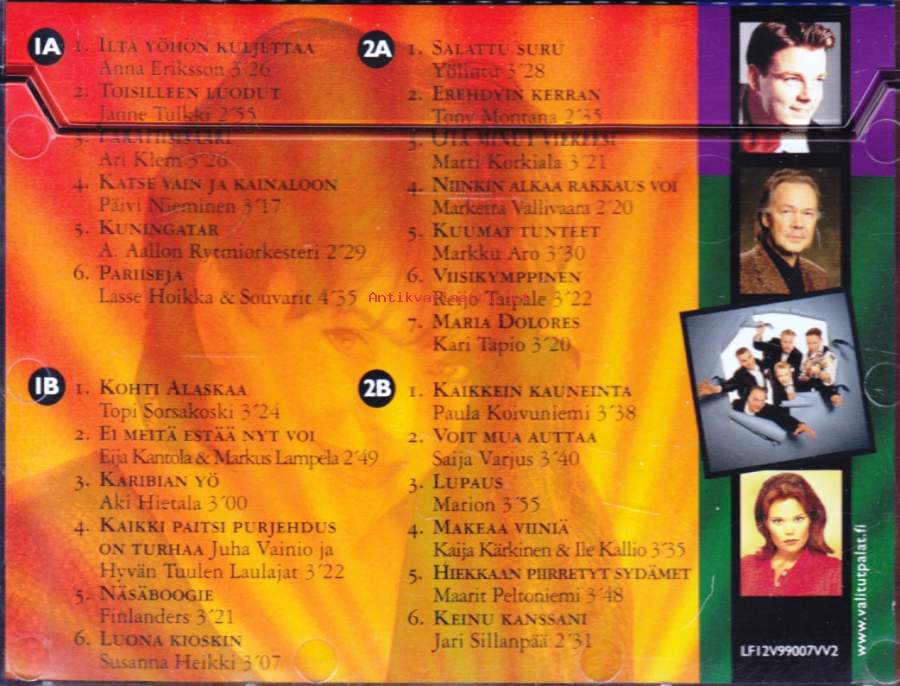**1-1 Anna Eriksson– Ilta Yöhön Kuljettaa3:26**1-2 Janne Tulkki– Toisilleen Luodut2:55**1-3 Ari Klem– Paratiisisaari3:26**1-4 Päivi Nieminen– Katse Vain ja Kainaloon3:17**1-5 A. Aallon Rytmiorkesteri– Kuningatar = Calendar Girl2:29**1-6 Lasse Hoikka & Souvarit– Pariiseja4:35**1-7 Topi Sorsakoski– Kohti Alaskaa = North To Alaska3:24**1-8 Eija Kantola & Markus Lampela– Ei Meitä Estää Nyt Voi2:49**1-9 Aki Hietala– Karibian Yö3:00**1-10 Juha Vainio Ja Hyvän Tuulen Laulajat– Kaikki Paitsi Purjehdus On Turhaa3:22**1-11 Finlanders– Näsäboogie3:21**1-12 Susanna Heikki– Luona Kioskin3:07**2-1 Yölintu– Salattu Suru = My Heart Must Do The Crying3:28**2-2 Tony Montana (13)– Erehdyin Kerran = Nessuno Mi Puo Giudicare2:35**2-3 Matti Korkiala– Ota Minut Viereesi3:21**2-4 Marketta Vallivaara– Niinkin Alkaa Rakkaus Voi = Samma Vägar Skall Vi Gå2:20**2-5 Markku Aro– Kuumat Tunteet3:30**2-6 Reijo Taipale– Viisikymppinen3:22**2-7 Kari Tapio– Maria Dolores3:20**2-8 Paula Koivuniemi– Kaikkein Kauneinta3:38**2-9 Saija Varjus– Voit Mua Auttaa3:40**2-10 Marion (9)– Lupaus3:55**2-11 Kaija Kärkinen & Ile Kallio– Makeaa Viiniä3:35**2-12 Maarit Peltoniemi– Hiekkaan Piirretyt Sydämet3:48**2-13 Jari Sillanpää– Keinu Kanssani = Quien Sera2:31Hämärtää 3:27**