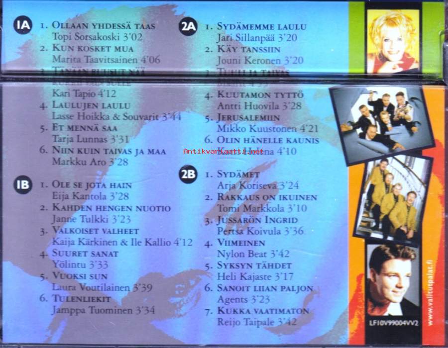 **1A1 Topi Sorsakoski– Ollaan Yhdessä Taas3:02**1A2 Marita Taavitsainen– Kun Kosket Mua4:06**1A3 Kari Tapio– Tänään Ruusut Nää Kukkii Vain Sulle4:12**1A4 Lasse Hoikka & Souvarit– Laulujen Laulu3:44**1A5 Tarja Lunnas– Et Mennä Saa3:31**1A6 Markku Aro– Niin Kuin Taivas Ja Maa3:28**1B1 Eija Kantola– Ole Se Jota Hain3:28**1B2 Janne Tulkki– Kahden Hengen Nuotio3:23**1B3 Kaija Kärkinen & Ile Kallio– Valkoiset Valheet4:12**1B4 Yölintu– Suuret Sanat3:33**1B5 Laura Voutilainen– Vuoksi Sun3:39**1B6 Jamppa Tuominen– Tulenliekit3:34**2A1 Jari Sillanpää– Sydämemme Laulu3:20**2A2 Jouni Keronen– Käy Tanssiin3:20**2A3 Maarit– Tuuli Ja Taivas4:53**2A4 Antti Huovila– Kuutamon Tyttö3:28**2A5 Mikko Kuustonen– Jerusalemiin4:21**2A6 Katri Helena– Olin Hänelle Kaunis4:10**2B1 Arja Koriseva– Sydämet3:24**2B2 Tomi Markkola– Rakkaus On Ikuinen3:10**2B3 Pertsa Koivula– Jussarön Ingrid3:36**2B4 Nylon Beat– Viimeinen3:42**2B5 Heli Kajaste– Syksyn Tähdet3:17**2B6 Agents (2)– Sanoit Liian Paljon3:23**2B7 Reijo Taipale– Kukka Vaatimaton3:42**