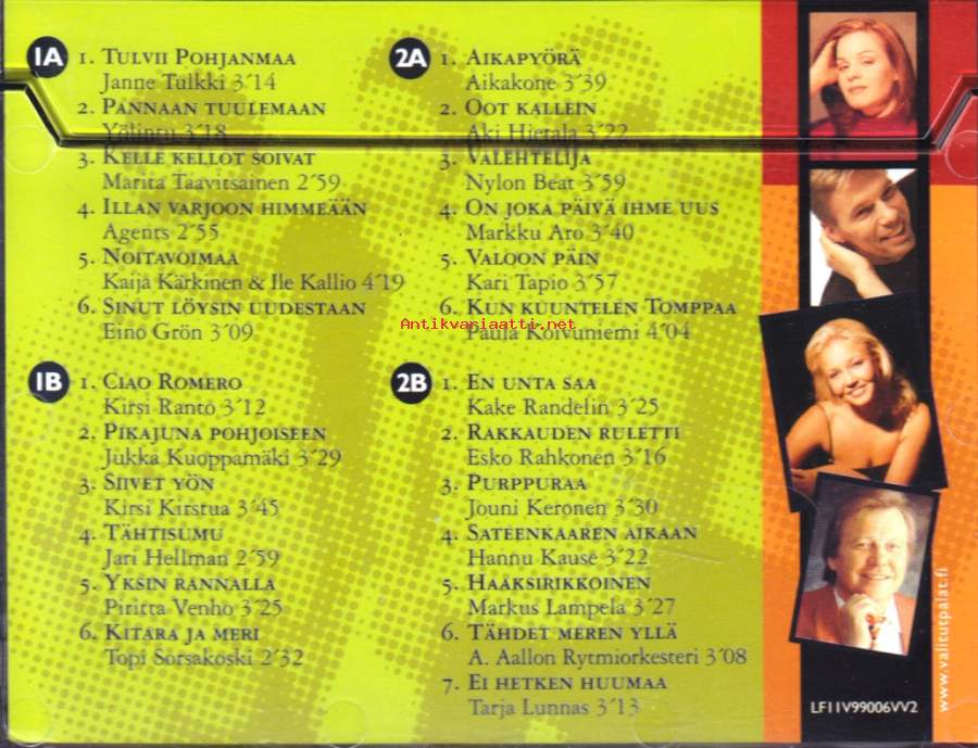 **A1 Janne Tulkki– Tulvii Pohjanmaa**A2 Yölintu– Pannaan Tuulemaan**A3 Marita Taavitsainen– Kelle Kellot Soivat**A4 Agents (2)– Illan Varjoon Himmeään**A5 Kaija Kärkinen & Ile Kallio– Noitavoimaa**A6 Eino Grön– Sinut Löysin Uudestaan**B1 Kirsi Ranto– Ciao Romero**B2 Jukka Kuoppamäki– Pikajuna Pohjoiseen**B3 Kirsi Kirstua– Siivet Yön**B4 Jari Hellman– Tähtisumu**B5 Piritta Venho– Yksin Rannalla**B6 Topi Sorsakoski– Kitara Ja Meri**C1 Aikakone– Aikapyörä**C2 Aki Hietala– Oot Kallein**C3 Nylon Beat– Valehtelija**C4 Markku Aro– On Joka Päivä Ihme Uus**C5 Kari Tapio– Valoon Päin**C-6 Paula Koivuniemi– Kun Kuuntelen Tomppaa**D1 Kake Randelin– En Unta Saa**D2 Esko Rahkonen– Rakkauden Ruletti**D3 Jouni Keronen– Purppuraa**D4 Hannu Kause– Sateenkaaren Aikaan**D5 Markus Lampela– Haaksirikkoinen**D6 A. Aallon Rytmiorkesteri– Tähdet Meren Yllä**D7 Tarja Lunnas– Ei Hetken Huumaa**
