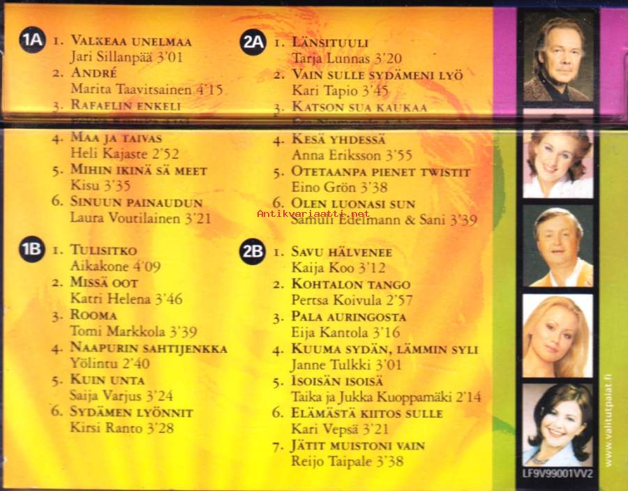 **1A-1 Jari Sillanpää– Valkeaa Unelmaa**1A-2 Marita Taavitsainen– André**1A-3 Pekka Ruuska– Rafaelin Enkeli**1A-4 Heli Kajaste– Maa Ja Taivas**1A-5 Kisu*– Mihin Ikinä Sä Meet**1A-6 Laura Voutilainen– Sinuun Painaudun**1B-1 Aikakone– Tulisitko**1B-2 Katri Helena– Missä Oot**1B-3 Tomi Markkola– Rooma**1B-4 Yölintu– Naapurin Sahtijenkka**1B-5 Saija Varjus– Kuin Unta**1B-6 Kirsi Ranto– Sydämen Lyönnit**2A-1 Tarja Lunnas– Länsituuli**2A-2 Kari Tapio– Vain Sulle Sydämeni Lyö**2A-3 Esa Nummela– Katson Sua Kaukaa**2A-4 Anna Eriksson– Kesä Yhdessä**2A-5 Eino Grön– Otetaanpa Pienet Twistit**2A-6 Samuli Edelmann & Sani (4)– Olen Luonasi Sun**2B-1 Kaija Koo– Savu Hälvenee**2B-2 Pertsa Koivula– Kohtalon Tango**2B-3 Eija Kantola– Pala Auringosta**2B-4 Janne Tulkki– Kuuma Sydän, Lämmin Syli**2B-5 Taika Kuoppamäki Ja Jukka Kuoppamäki– Isoisän Isoisä**2B-6 Kari Vepsä– Elämästä Kiitos Sulle**2B-7 Reijo Taipale– Jätit Muistoni Vain**