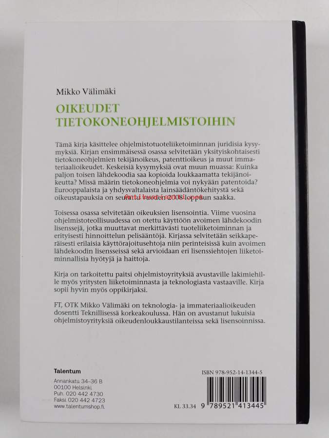 Asiasanat: lainsäädäntö, tekijänoikeus, tietotekniikka, tietokoneet, liiketoiminta, kuluttajansuoja, sopimukset, immateriaalioikeus, patentit, tavaramerkit, patentointi, tietotekniikkayritykset, mallioikeus, ohjelmistotuotanto, tietokoneohjelmat, ohjelmistoteollisuus, lisenssit, COMPUTERS, vapaat ohjelmistot, Information technology, avoin lähdekoodi, käyttöoikeus, ohjelmistoliiketoiminta, ohjelmistot (taiteet)