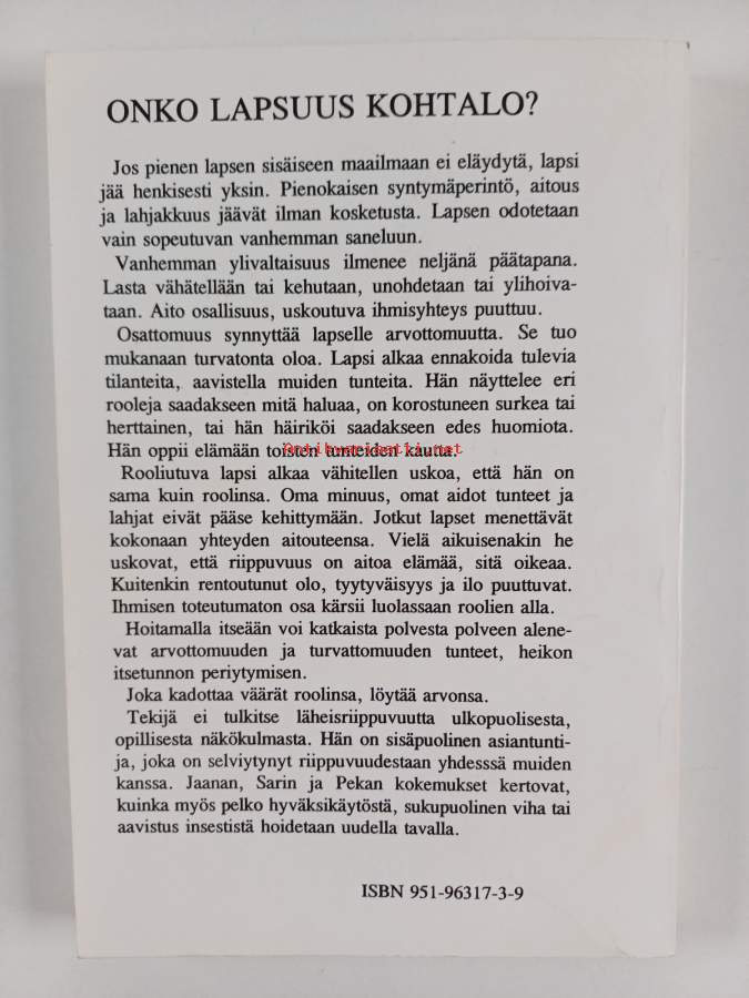 Asiasanat: persoonallisuuden kehitys, psyykkinen kehitys, itsetunto, riippuvuus, hoito, seksuaalisuus, syyllisyydentunne, läheisriippuvuus, vanhempi-lapsisuhde, kriisit, äidit, isät, minäkuva, insesti, roolit, syrjäytyminen, ryhmät, ryhmäterapia