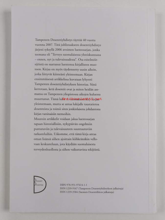 Muu(t) tekijä(t): Pertti PohjolainenSarja: Tampereen dosenttiyhdistyksen julkaisuja nro 2; Suomen dosenttiliiton julkaisuja nro 3Asiasanat: taudit, terveysvaikutukset, terveys, vanheneminen, terveyskäyttäytyminen, ympäristön tila, elintavat, vesihuolto, ikääntyminen, terveydenhuolto, huumeet, kunnallistalous, kansanterveys, ympäristöterveys