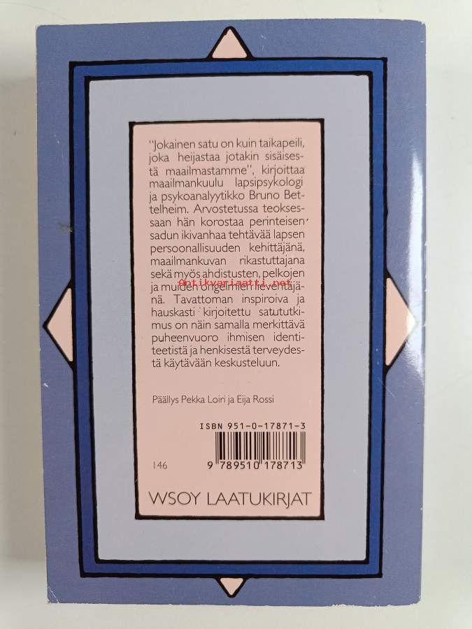 Muu(t) tekijä(t): Mirja RutanenMerkinnät: omistajamerkintäSarja: LaatukirjatAlkuteos: The uses of enchantmentAsiasanat: persoonallisuuden kehitys, sadut, psykoanalyyttiset teoriat, lapsipsykologia