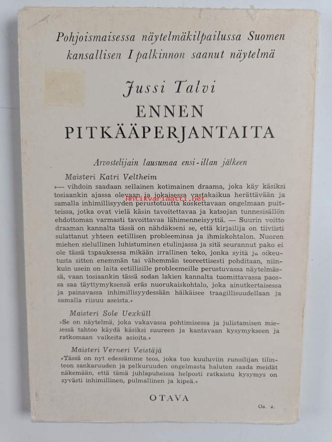 Hyvä. Hieman kulumaa, selkämyksessä hieman vinoutta, selkämyksessä lukutaittumaa, takana hintalapun jäämää