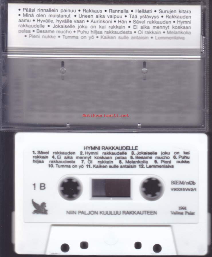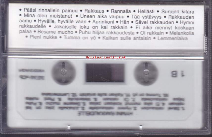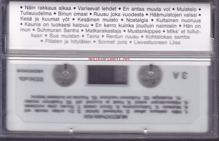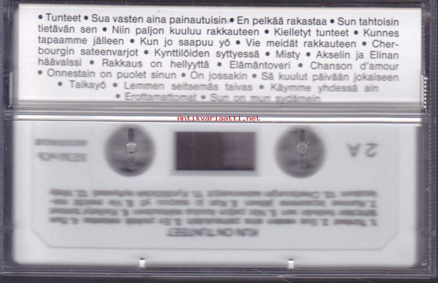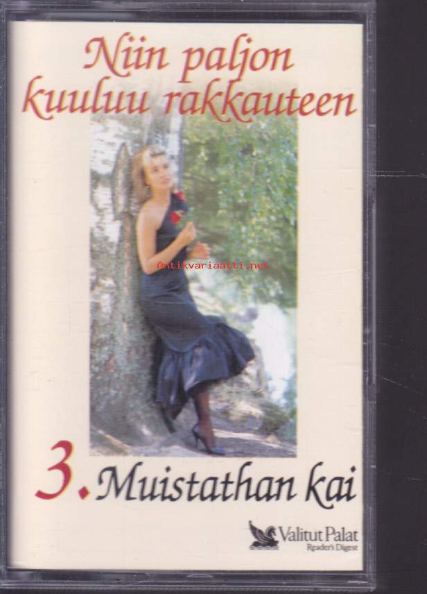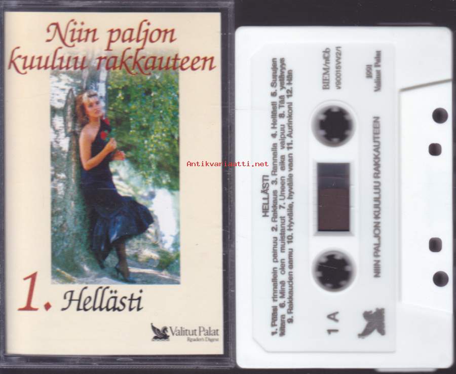 ** Hellästi A1 Kirka– Pääsi Rinnallein PainuuA2 Lea Laven– RakkausA3 Arja Koriseva– RannallaA4 Antti Sarpila– HellästiA5 Topi Sorsakoski– Surujen KitaraA6 Kim Lönnholm– Minä Olen MuistanutB1 Kisu*– Uneen Aika VaipuuB2 Arja Koriseva– Tää YstävyysB3 Juhani Markola– Rakkauden AamuB4 Pasi Kaunisto– MelankoliaB5 Jamppa Tuominen– AurinkoniB6 Markku Suominen– Hän**Hymni Rakkaudelle C1 Eino Grön– Sävel RakkaudenC2 Lea Laven– Hymni RakkaudelleC3 Kai Hyttinen– Jokaiselle Joku On Kai RakkainC4 Jaana Lammi– Ei Aika Mennyt Koskaan PalaaC5 Tapani Kansa– Besame MuchoC6 Fredi– Puhu Hiljaa RakkaudestaD1 Kai Hyttinen– Oi RakkainD2 Tamara Lund– Hyväile, Hyväile VaanD3 Fredi– Pieni NukkeD4 Taneli Mäkelä– Tumma On YöD5 Armi & Danny*– Kaiken Sulle AntaisinD6 Reijo Taipale– Lemmenlaiva**Kun On Tunteet E1 Mona Carita– TunteetE2 Paula Koivuniemi– Sua Vasten Aina PainautuisinE3 Marion (9)– En Pelkää RakastaaE4 Arja Koriseva– Sun Tahtoisin Tietävän SenE5 Fredi– Niin Paljon Kuuluu RakkauteenE6 Kake Randelin– Kielletyt TunteetF1 Martin Brushane Big Band– Kunnes Tapaamme JälleenF2 Kalevi Korpi– Kun Jo Saapuu YöF3 Aikamiehet– TaikayöF4 Eino Grön– Cherbourgin SateenvarjotF5 Savonlinnan Oopperajuhlakuoro– Kynttilöiden SyttyessäF6 Martin Brushane Big Band Ja Harry Stenfors– Misty**Käymme Yhdessä Ain G1 Tapani Kansa– Akselin Ja Elinan HäävalssiG2 Marion (9)– Rakkaus On HellyyttäG3 Eero Aven– ElämäntoveriG4 Lea Laven– Chanson D'amourG5 Kisu*– Onnestain On Puolet SinunG6 Eino Grön– On JossakinH1 Eino Grön– Sä Kuulut Päivään JokaiseenH2 Lea Laven– Vie Meidät RakkauteenH3 Mikko Järvinen– Lemmen Seitsemäs TaivasH4 Tapani Kansa– Käymme Yhdessä AinH5 Esko Rahkonen– ErottamattomatH6 Seppo Ruohonen– Sun On Mun Sydämein**Muistathan Kai I1 Sonja Lumme– Näin Rakkaus AlkaaI2 Teuvo Oinas– Varisevat LehdetI3 Paula Koivuniemi– En Antaa Muuta VoiI4 Pasi Kaunisto– MuisteloI5 Reijo Taipale– TulisuudelmaI6 Tamara Lund– Sinun OmasiJ1 Reijo Taipale– Ruusu Joka VuodestaJ2 Raimo Piipponen Ja Tulipunaruusut– Häämuiistojen ValssiJ3 Jamppa Tuominen– Kesä Ja Kuumat YötJ4 Reijo Taipale– Kesäinen MuistoJ5 Francis Goya– NostalgiaJ6 Savonlinnan Oopperajuhlakuoro– Kultainen Nuoruus**Hupilauluja Rakkaudesta K1 Irwin Goodman– En Kerro Kuinka Jouduin NaimisiinK2 Hanne– Hän On MunK3 Esa Pakarinen– Suhmuran SantraK4 Juha Vainio– MatkarakastajaK5 Tarja Ylitalo– MustankippeeK6 Pirkka-Pekka Petelius– Miks' Et TullutkaanK7 Juha Vainio– Sua MuistanL1 Solistiyhtye Suomi– TainaL2 Irwin Goodman– Rentun RuusuL3 Vesa-Matti Loiri– Kohtalokas SambaL4 Rauli "Badding" Somerjoki*– Fiilaten Ja HöylätenL5 Anita Hirvonen– Sormet PoisL6 Irwin Goodman– Lievestuoreen Liisa **Kuutamolla Kahden M1 Tapani Kansa– Hopeinen KuuM2 Tauski Ja Helena Miller– HaavemaaM3 Pasi Kaunisto– Tähdet KertovatM4 Anneli Sari– Kielletyt LeikitM5 Tapani Kansa– Kun HämärtääM6 Topi Sorsakoski– TäysikuuN1 Reijo Taipale– Kuutamolla KahdenN2 Päivi Paunu– Tähtien KertomaaN3 Francis Goya– Koskaan Rakkaus Kuole EiN4 Tapani Perttu– Ootko Yksin Sä NytN5 Reijo Taipale– SatumaaN6 Rainer Friman– Oi Kuu, Oi Kuu **Rakkauden Syksy O1 Olavi Virta– Rakkautta Ei Se OllutO2 Four Cats– IkäväO3 Finlanders– Kylmä RakkausO4 Pave Maijanen– Näinkö Rakkaus PalkitaanO5 Kari Tapio– Tanssi Loppuun RakkaudenO6 Taneli Mäkelä– Sydämesi Tyhjä HuoneP1 Carola (2)– Rakkauden JälkeenP2 Esko Rahkonen– Rakasta, Kärsi Ja UnhoitaP3 Arja Koriseva– Ei Toinen Sua SaaP4 Topi Sorsakoski– SydänsurujaP5 Pasi Kaunisto– VilliruusuP6 Pekka Himanka– Kaunis On Luoksesi Kaipuu