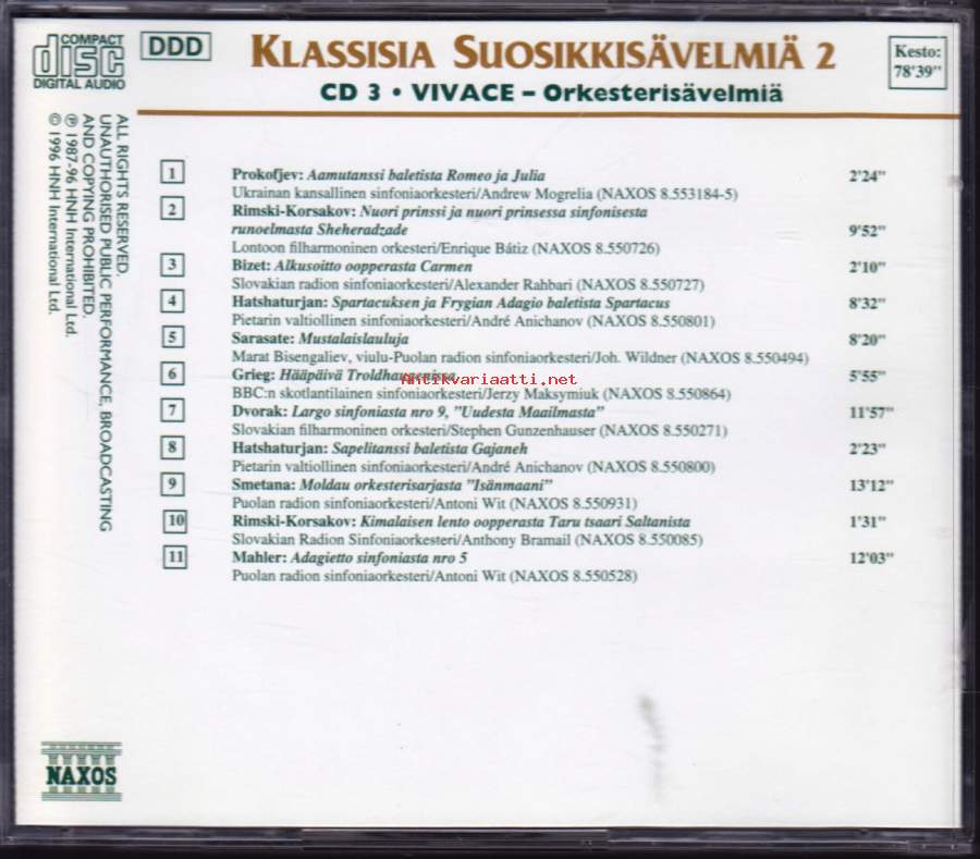 ** Vivace - Orkesterisävelmiä **3-1 Ukrainan Kansallinen Sinfoniaorkesteri*, Andrew Mogrelia– Aamutanssi Baletista Romeo ja Julia**3-2 Lontoon Filharmoninen Orkesteri*, Enrique Batiz– Nuori Prinssi Ja Nuori Prinsessa Sinfonisesta Runoelnmasta Sheheradzade**3-3 Slovakian Radion Sinfoniaorkesteri*, Alexander Rahbari– Alkusoitto Oopperasta Carmen**3-4 Pietarin Valtiollinen Sinfoniaorkesteri*, André Anichanov– Spartacuksen Ja Frygian Adagio Baletista Spartacus**3-5 Puolan Radion Sinfoniaorkesteri*, Johannes Wildner, Marat Bisengaliev– Mustalaislauluja**3-6 BBC:n Skotlantilainen Sinfoniaorkesteri*, Jerzy Maksymiuk– Hääpäivä Troldhaugenissa**3-7 Slovakian Filharmoninen Orkesteri*, Stephen Gunzenhauser– Largo Sinfoniasta Nro 9 "Uudesta Maailmasta"**3-8 Pietarin Valtiollinen Sinfoniaorkesteri*, André Anichanov– Sapelitanssi Baletista Gajaneh**3-9 Puolan Radion Sinfoniaorkesteri*, Antoni Wit– Moldau Orkesterisarjasta "Isänmaani"**3-10 Slovakian Radion Sinfoniaorkesteri*, Anthony Bramall– Kimalaisen Lento Oopperasta Taru Tsaari Saltanista**3-11 Puolan Radion Sinfoniaorkesteri*, Antoni Wit– Adagietto Sinfoniasta Nro 5**
