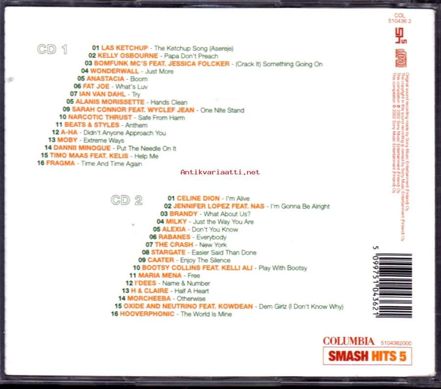2-CD - Smash Hits 5. 2002. ( Electronic, Hip Hop, Rock, Latin,RnB/Swing, House, Pop Rock). Columbia 510436 2. Tupla-CD, 32 raitaa.