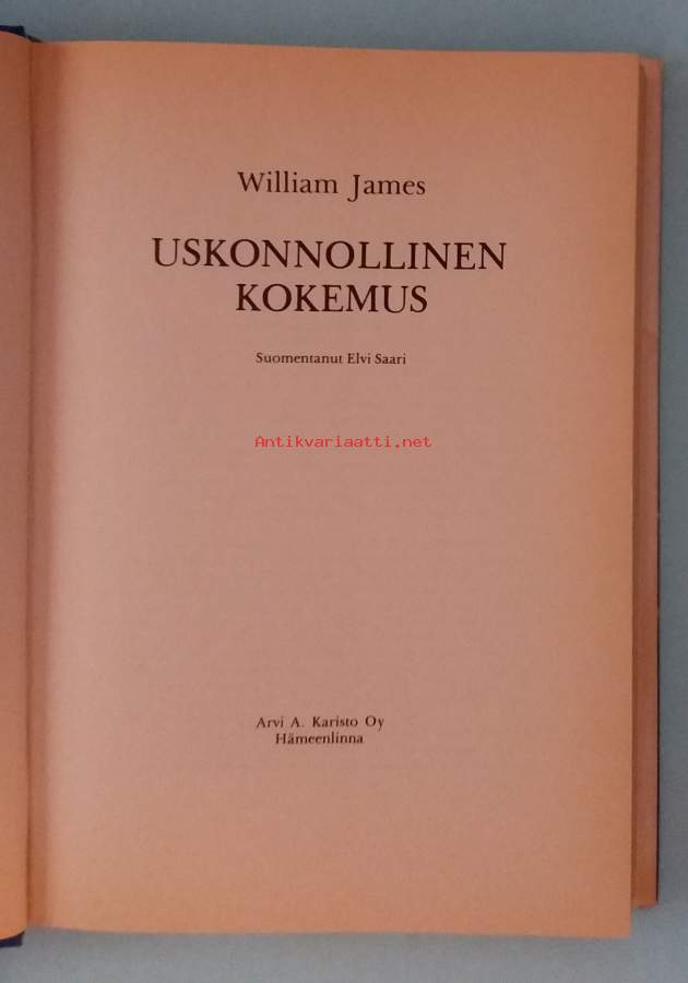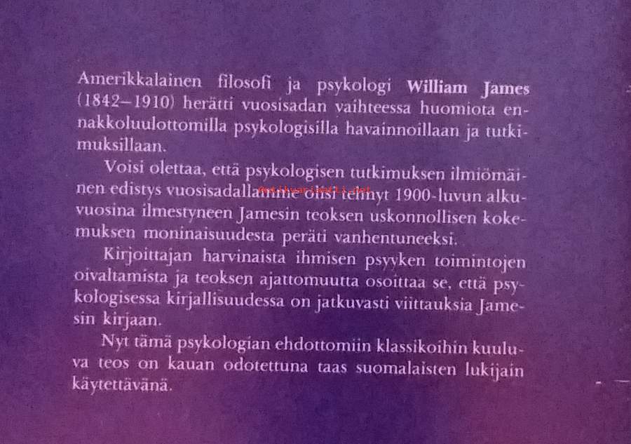 Teos tutkii uskonnollisen elämän psykologisia ulottuvuuksia keskittyen yksilön henkilökohtaiseen kokemukseen jumalallisesta ja se perustuu William Jamesin Oxfordin yliopistossa vuosina 1901–1902 pitämiin luentoihin. James esittää mm. laajan määritelmän jumaluudelle, joka kattaa kaiken, mikä antaa yksilölle tunteen alkuperäisestä totuudesta.Dimensiot 25 ¤ 18 cm