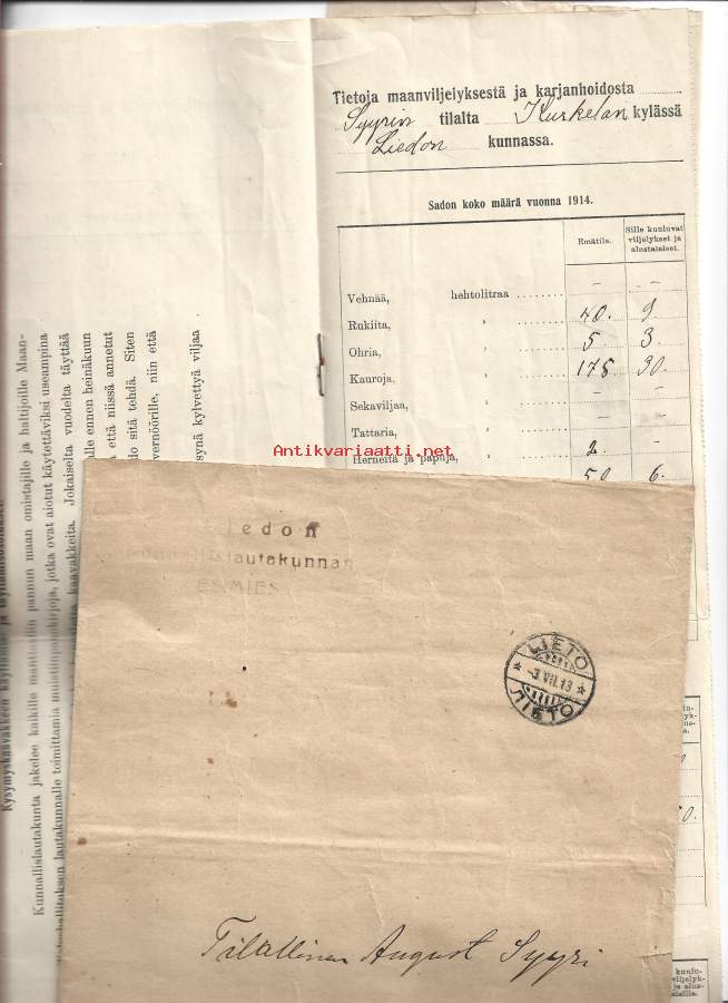 Tietoja maanviljelystä ja karjanhoidosta Syyrin tila Kurkelan kylä Lieto 1914 - 15