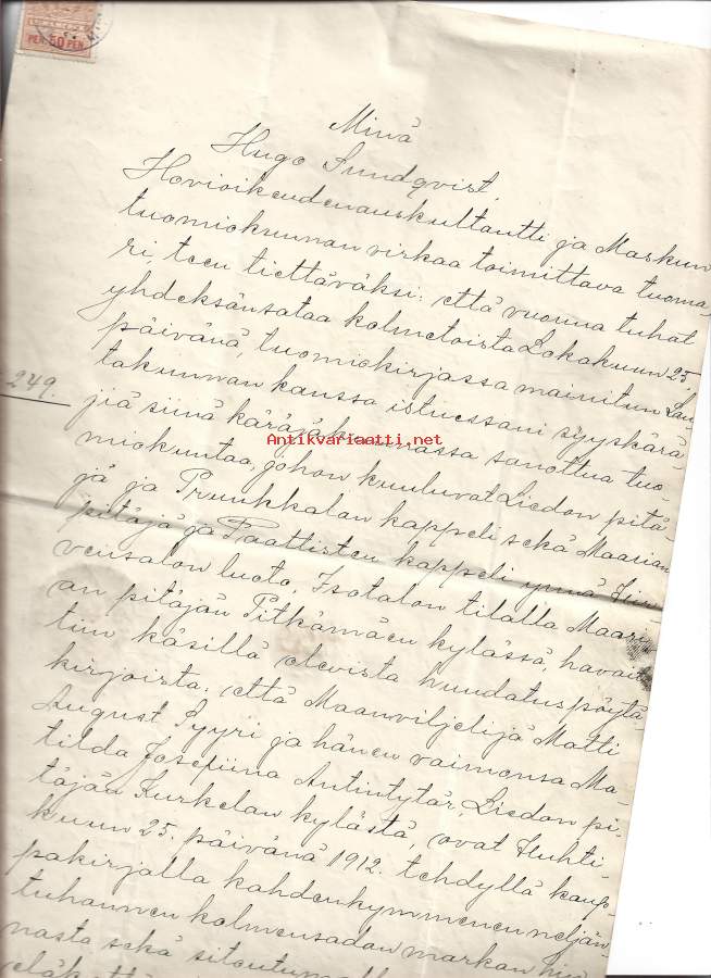 Minä Hugo Sundqvist, Hovioikeudenauskultantti ja Maskun tuomiokunnan tuomari teen tiettäväksi ... 1913