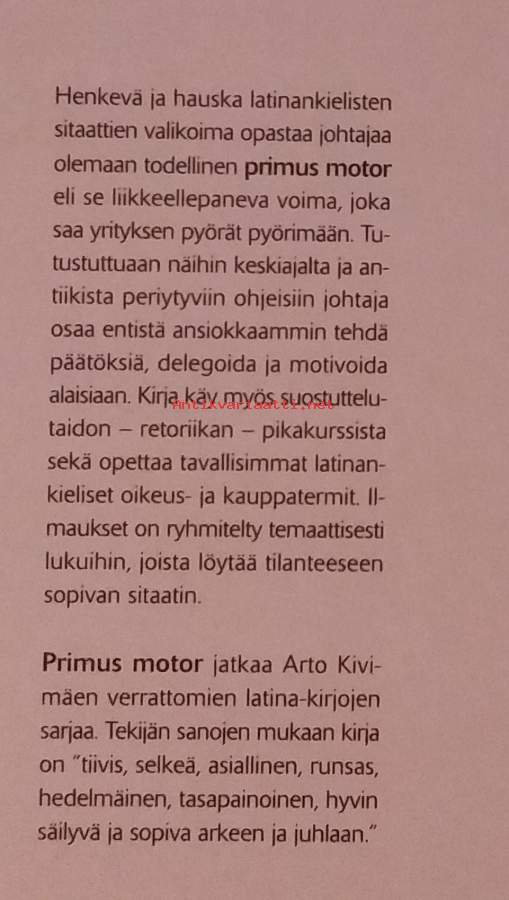 Teos kokoaa latinalaisia sitaatteja ja fraaseja johdattamalla lukijaa antiikin ja keskiajan opetuksiin päätöksenteosta, motivaatiosta ja retoriikasta, auttaen esimiestä toimimaan yrityksen liikkeellepanevana voimana, eli todellisena primus motorina. Dimensiot 21 ¤ 15 cm.