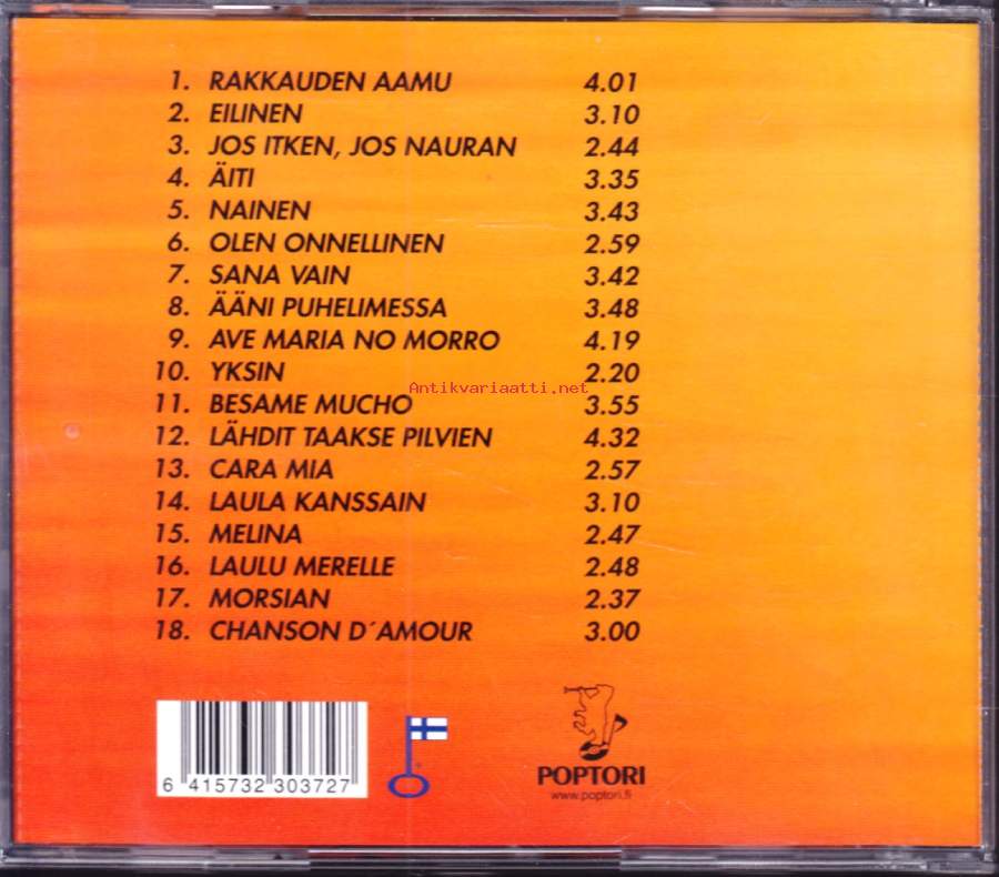 **1 Juhani Markola – Rakkauden Aamu = Quieres Ser Mi Amanté4:01**2 Juhani Markola – Eilinen = Yesterday3:10**3 Juhani Markola – Jos Itken, Jos Nauran = Se Piangi, Se Ridi2:44**4 Juhani Markola – Äiti = La Mama3:35**5 Juhani Markola – Nainen = Mujer3:43**6 Juhani Markola – Olen Onnellinen = You Belong To My Heart2:59**7 Juhani Markola – Sana Vain3:42**8 Juhani Markola – Ääni Puhelimessa = Le Telephone Pleure3:48**9 Juhani Markola – Ave Maria No Morro4:19**10 Juhani Markola – Yksin = Mr. Lonely2:20**11 Herttuat & Juhani Markola – Besame Mucho = Besame Mucho, Senora3:55**12 Juhani Markola – Lähdit Taakse Pilvien = Soleado4:32**13 Juhani Markola – Cara Mia2:57**14 Juhani Markola – Laula Kanssain = Sing My Love Song3:10**15 Juhani Markola – Melina2:47**16 Juhani Markola – Laulu Merelle2:48**17 Juhani Markola – Morsian = La Novia2:37**18 Herttuat & Juhani Markola – Chanson D’amour3:00