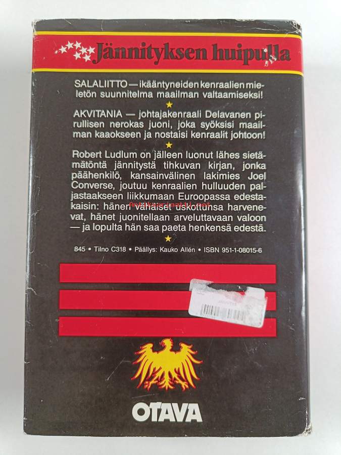 Erinomainen. Tarkempi kuntoluokka: K4- ; Pienoista kolhua selkämyksen yläreunassa, takana hintalapun jäämää. Kansipaperin kunto: repeämiä/kulumaa