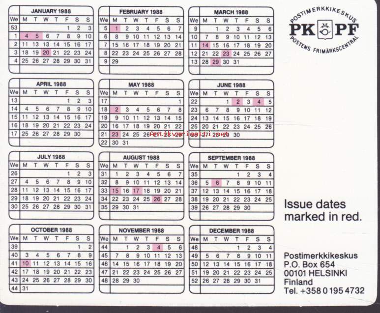 Postimerkkikeskus - Postimerkkien julkaisukalenteri 1988. Muovitettu. 8 x 10 cm.