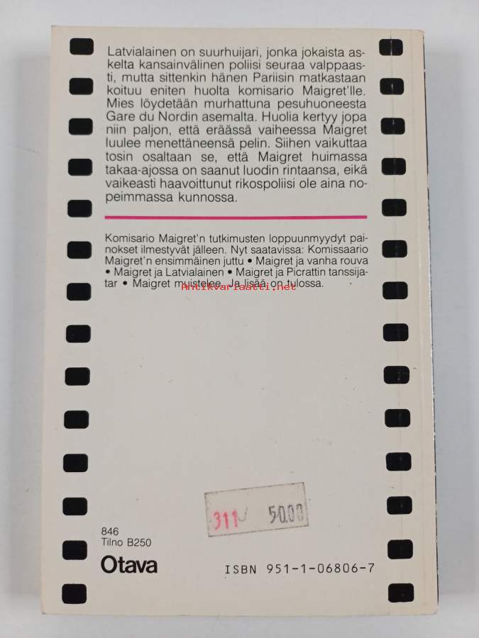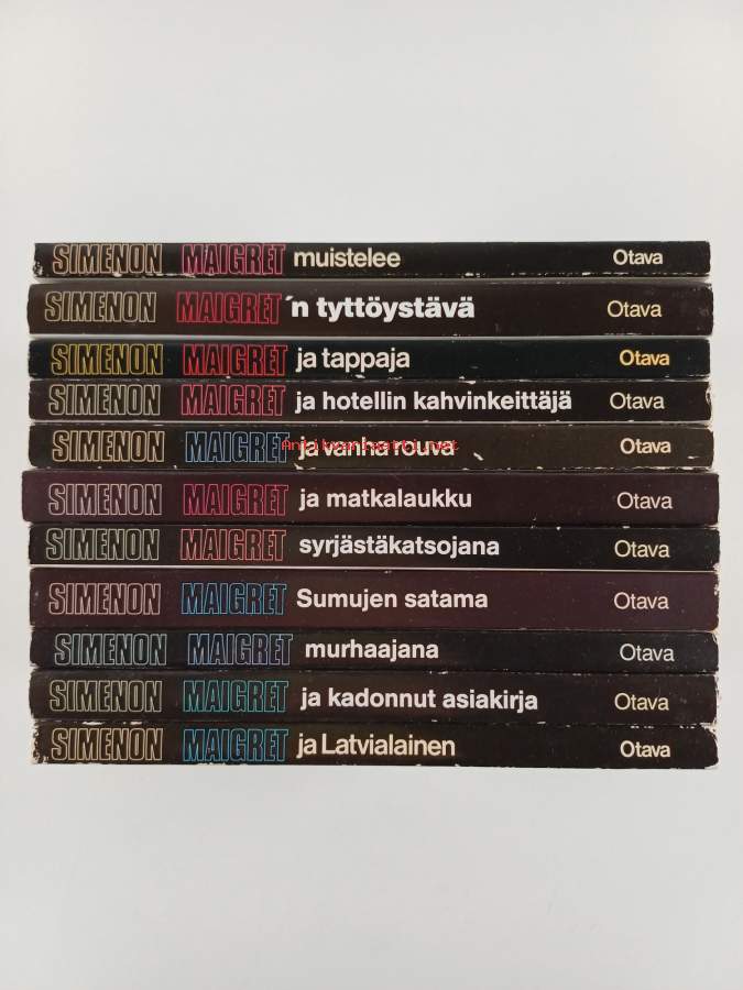 Koko nimi: Maigret -setti (11 kirjaa) : Maigret muistelee ; Maigret ja latvialainen ; Maigret murhaajana ; Maigret ja kadonnut asiakirja ; Sumujen satama ; Maigret syrjästäkatsojana ; Maigret ja hotellin kahvinkeittäjä ; Maigret´n tyttöystävä ; Maigret ja tappaja ; Maigret ja vanha rouva ; Maigret ja matkalaukkuSarja: MaigretAlkuteos: Mon ami Maigret