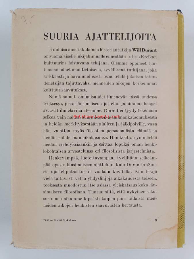 Muu(t) tekijä(t): J. A. HolloAlkuteos: The Story of Philosophy : The Lives and Opinions of the Greater PhilosophersAsiasanat: filosofia, filosofit