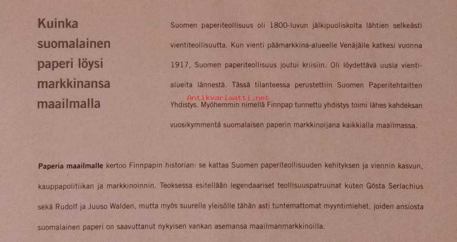 Paperia maailmalle kertoo Finnpapin historian: se kattaa Suomen paperiteollisuuden kehityksen, ja viennin kasvun, kauppapolitiikan ja markkinoinnin. Teoksessa esitellään legendaariset teollisuusjohtajat kuten Gösta Serlachius sekä Rudolf ja Juuso Walden, mutta myös suurelle yleisölle tähän asti tuntemattomat myyntimiehet, joiden ansiosta suomalainen paperi on saavuttanut nykyisen vankan asemansa maailmanmarkkinoilla. Kuvitettu. Dimensiot 21 ¤ 22 cm.