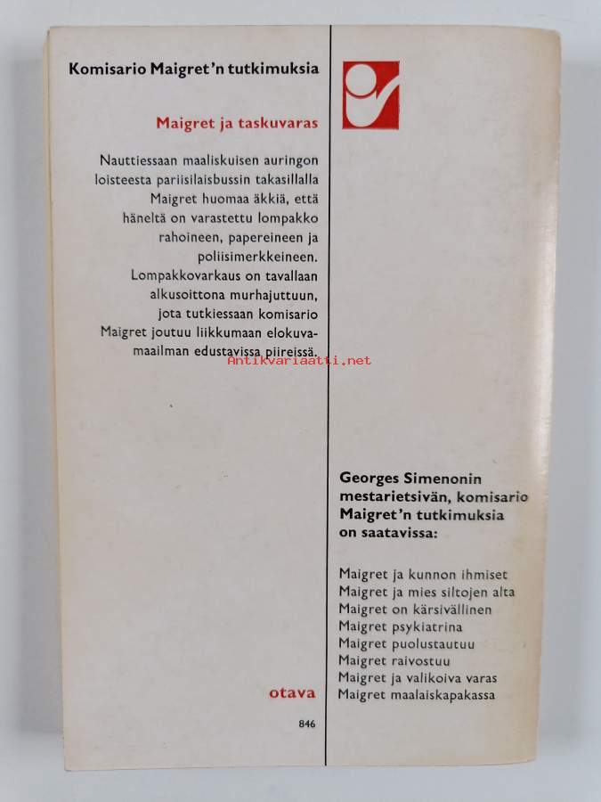 Muu(t) tekijä(t): Irmeli SallamoSarja: Komisario Maigret'n tutkimuksiaAlkuteos: Le voleur de MaigretAsiasanat: salapoliisikirjallisuus