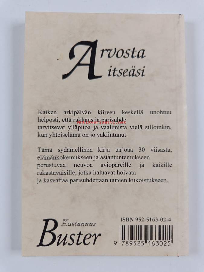 Muu(t) tekijä(t): Satu Vuoksenturja, R. W. AlleySarja: Arvosta itseäsiAlkuteos: Be-good-to-your-marriage therapyAsiasanat: elämäntaito, ihmissuhteet, parisuhde, avioliitto, rakkaus