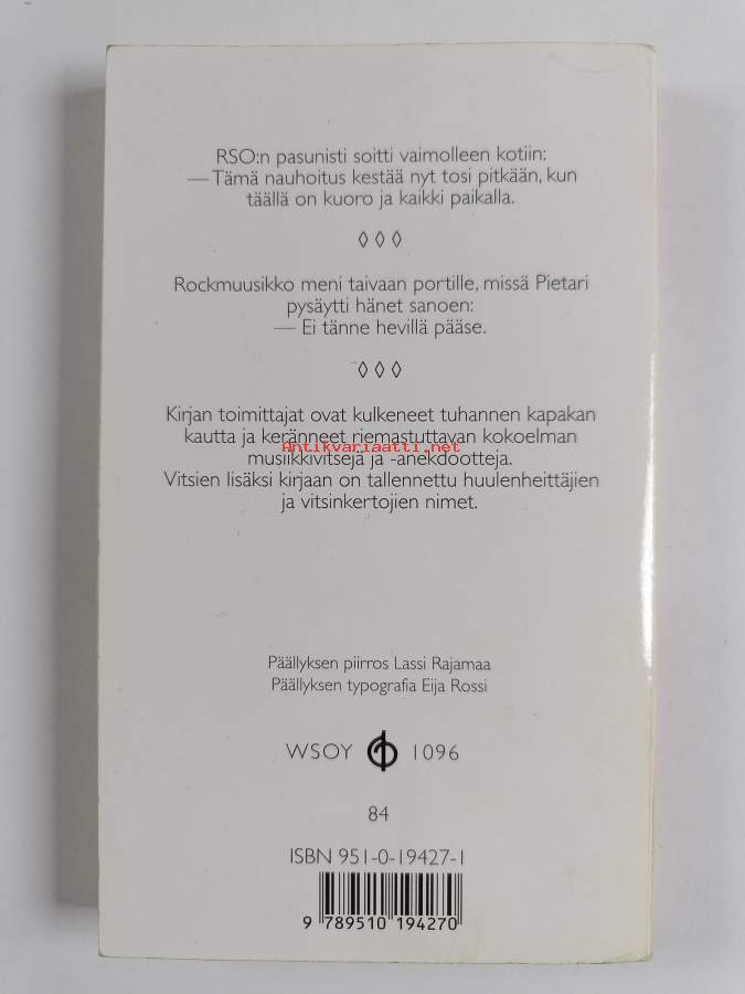 Suu messingillä - Musiikkivitsejä, 2000. 2.p. Riemastuttava kokoelma musiikkivitsejä ja -anekdootteja. Vitsinkertojien nimet esillä.