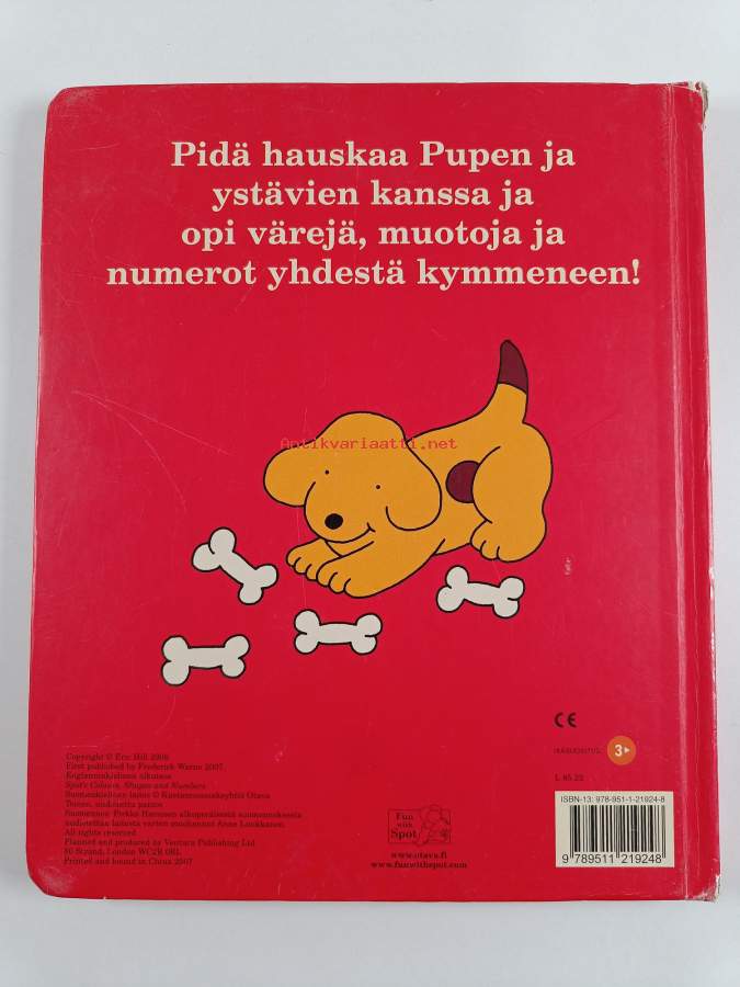 Muu(t) tekijä(t): Pirkko Harainen, Anne LuukkanenAlkuteos: Spot's colours, shapes and numbersAsiasanat: lastenkirjallisuus, koira, värit, numerot, laskeminen, muodot, kuvakirjat, paksulehtiset kirjat