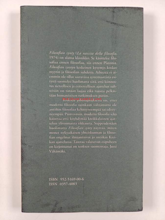 Muu(t) tekijä(t): Jussi VähämäkiSarja: Tutkijaliiton julkaisu 82 ; ParadeigmaAlkuteos: La nascita della filosofiaAsiasanat: historia, antiikki, myytit, filosofia, kreikka, esisokraattisuus