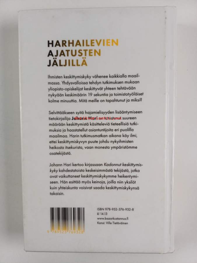 Muu(t) tekijä(t): Timo KorppiAlkuteos: Stolen focusAsiasanat: Internet, yhteiskuntakehitys, riippuvuus, ajankäyttö, viestintä, stressi, uupumus, ajattelu, teknologinen kehitys, syyt, lukeminen, tarkkaavaisuus, teknologiayritykset, manipulaatio, ADHD, informaatio, seuraukset, nopeus, keskeyttäminen, keskittymiskyky, ratkaisut (vastaukset), heikentyminen, manipulaatio (psykologia)