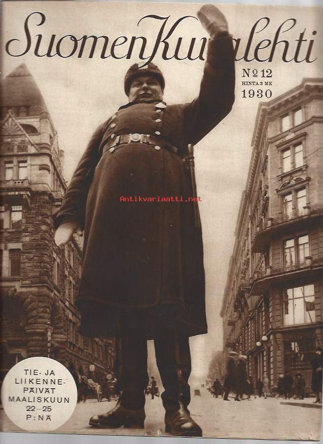 Suomen Kuvalehti 1930 nr 12 / Tie- ja liikennepäivät, isä ja äiti piirustuskilpailu, Jäämeren valtatie, Kiannon kirje Kannakselta, neljällä pyörällä