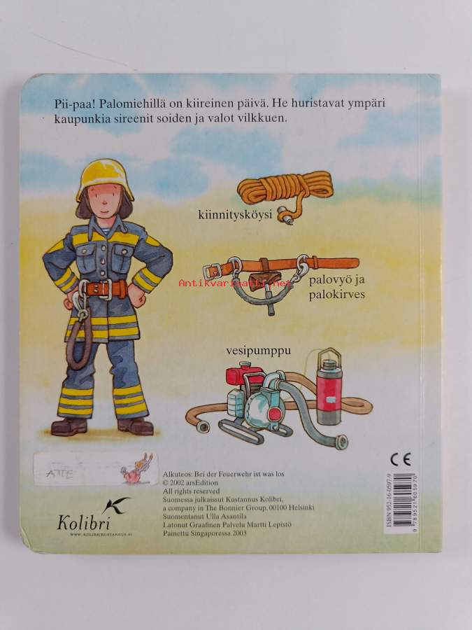 Muu(t) tekijä(t): Ulla AsantilaMerkinnät: omistajamerkintä (tarra)Alkuteos: Bei der Feuerwehr ist was losAsiasanat: lastenkirjallisuus, paloautot, palokunnat, palomiehet, kuvakirjat, paksulehtiset kirjat