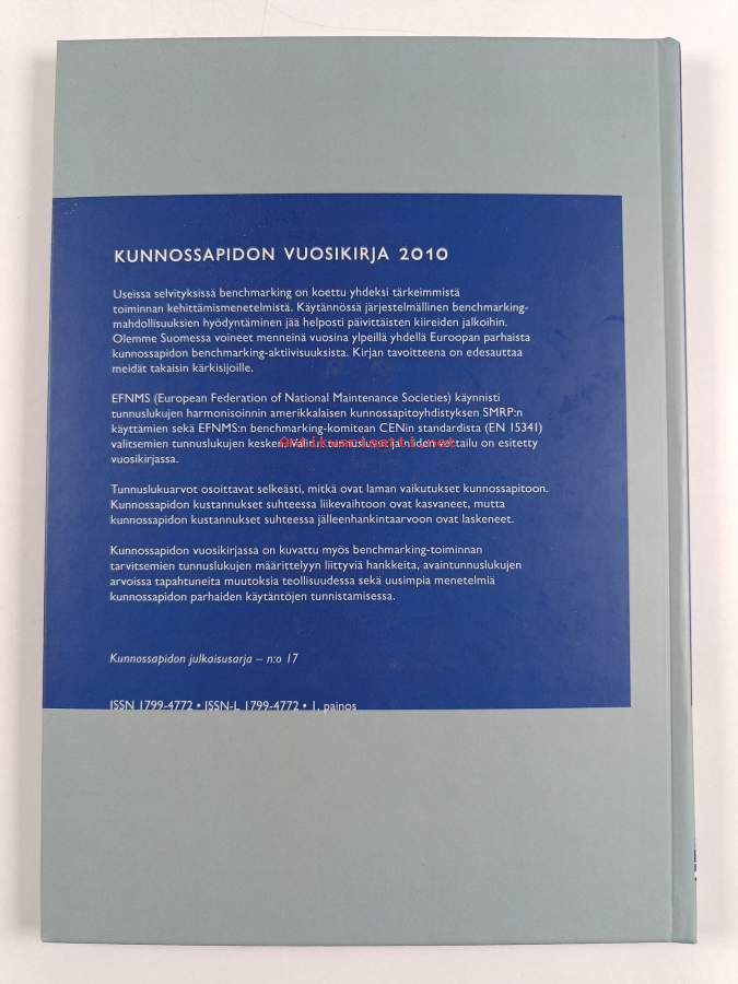 Muu(t) tekijä(t): Kari Komonen, Susanna Kunttu ym.Sarja: Kunnossapidon julkaisusarja n:o 17; Kunnossapidon vuosikirja 2010Asiasanat: teollisuus, tunnusluvut, benchmarking, kunnonvalvonta, tuotantotekniikka, kunnossapito, standardit, käynnissäpito, kunnostustarve