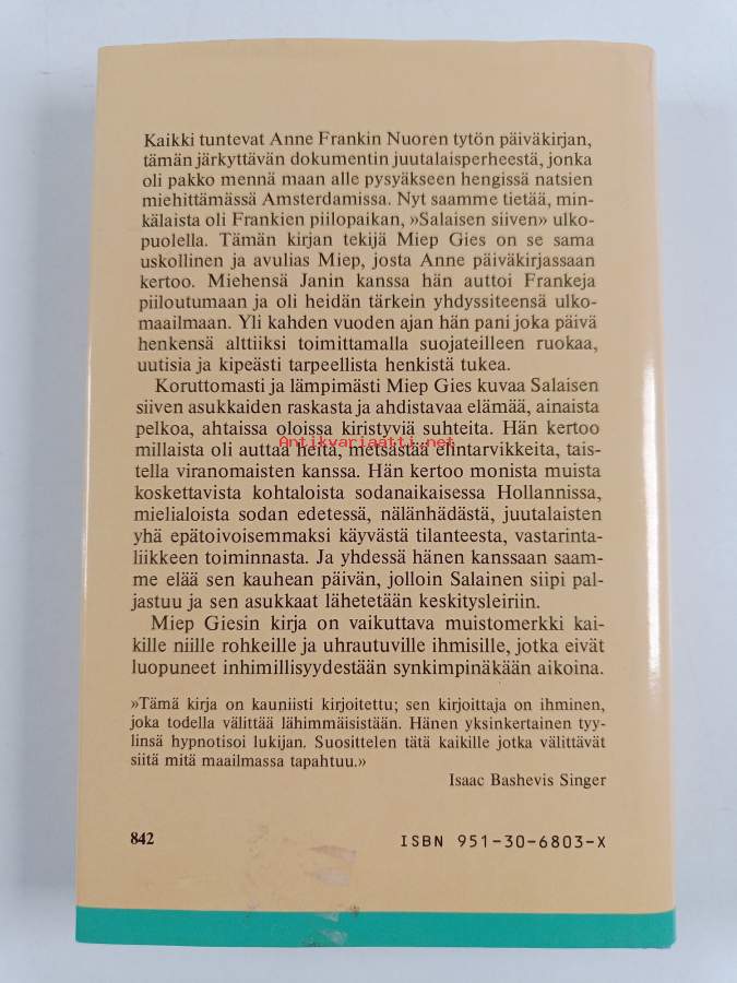 Anne Frank- suojattini.Mieb Gies Anne Frankin perhettä auttanut nainen kertoo. P.1988, toinen painos.Toisen maailman sodan järjettömiä kokemuksia. Valokuvia 31kpl.