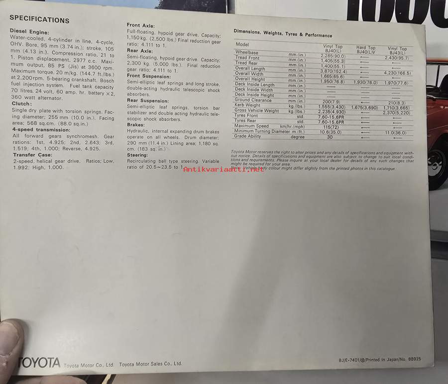 Toyota Land cruiser BJ 40, BJ 40 V ja BJ 43 1974 myyntiesite.