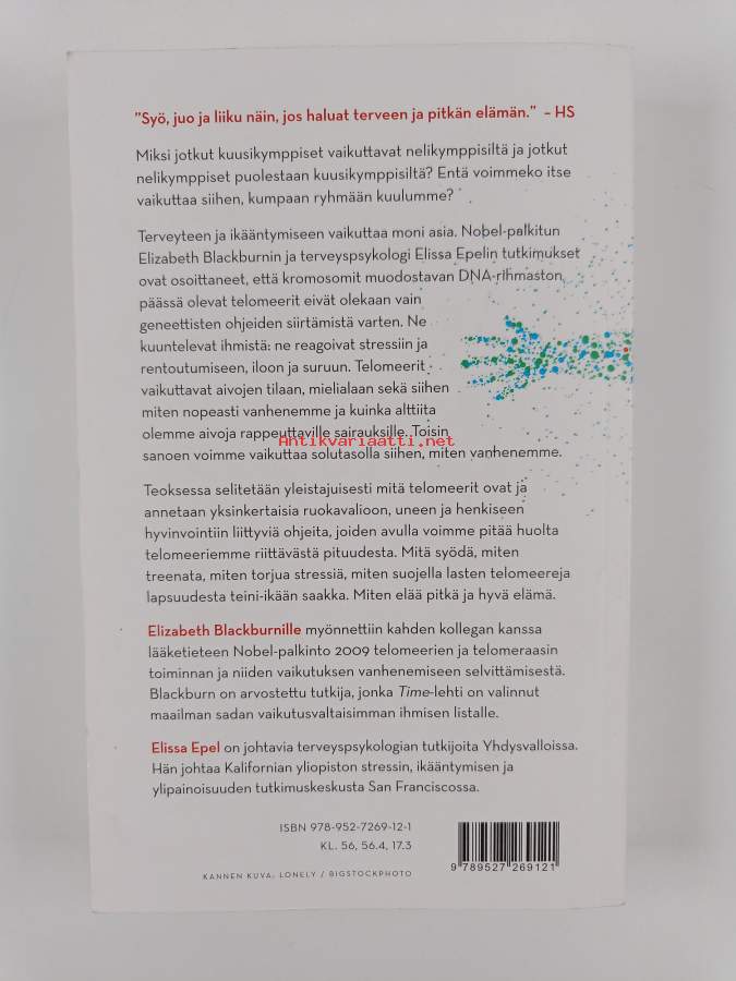 Muu(t) tekijä(t): Teija Hartikainen, Elissa EpelAlkuteos: The telomere effectAsiasanat: terveyskäyttäytyminen, elintavat, ikääntyminen, ikä, DNA, solut, pitkäikäisyys, elinvoimaisuus, kromosomit, telomeerit